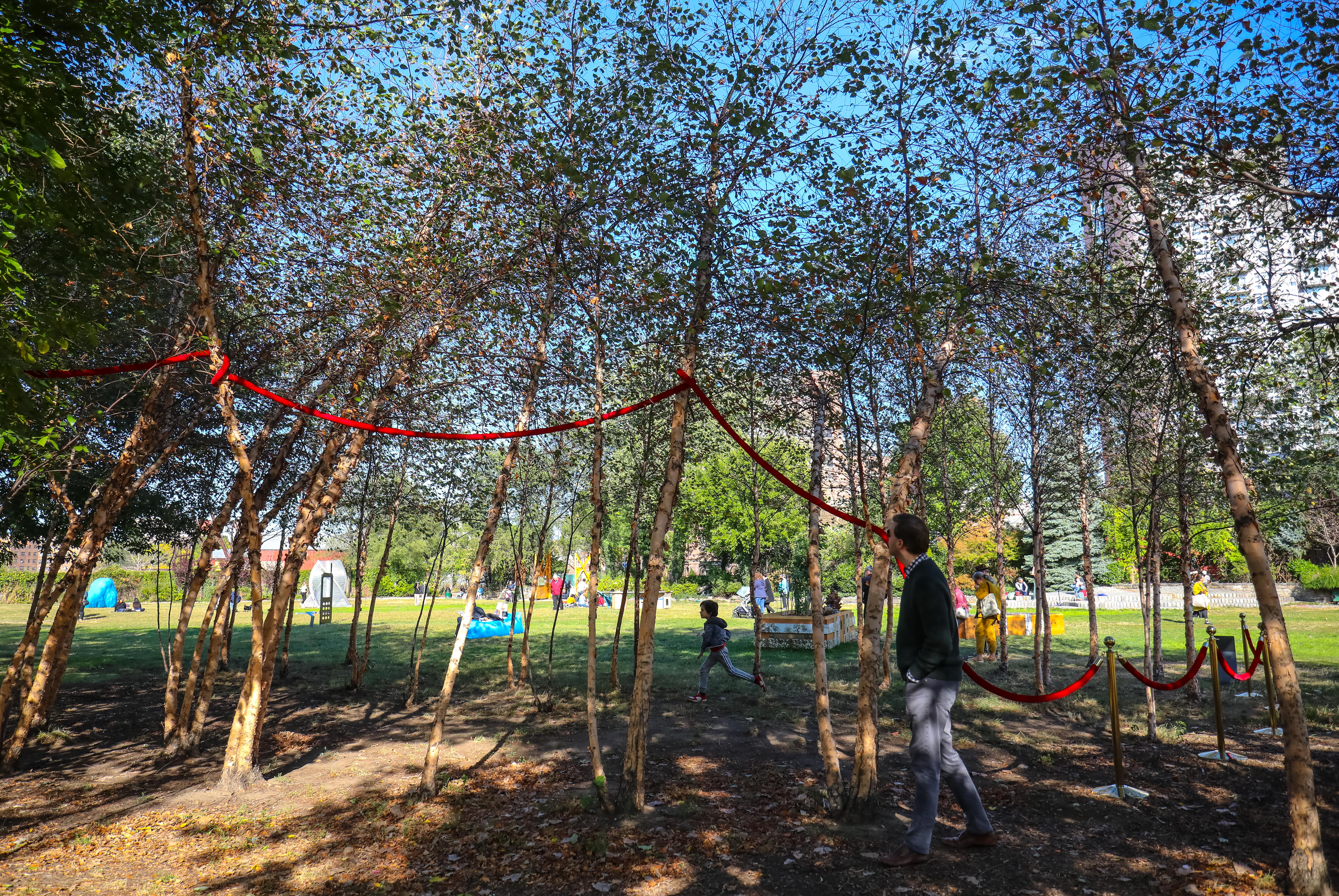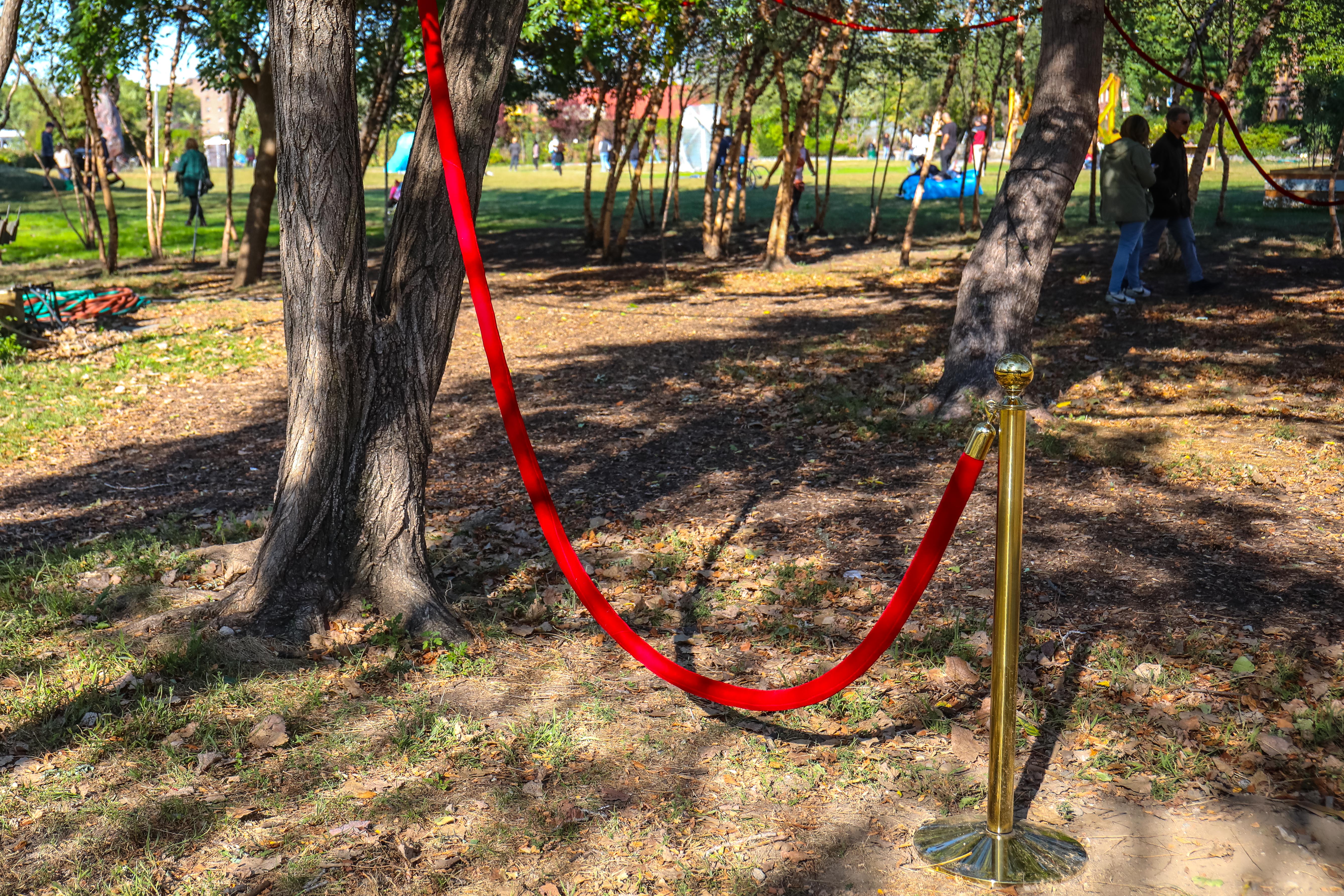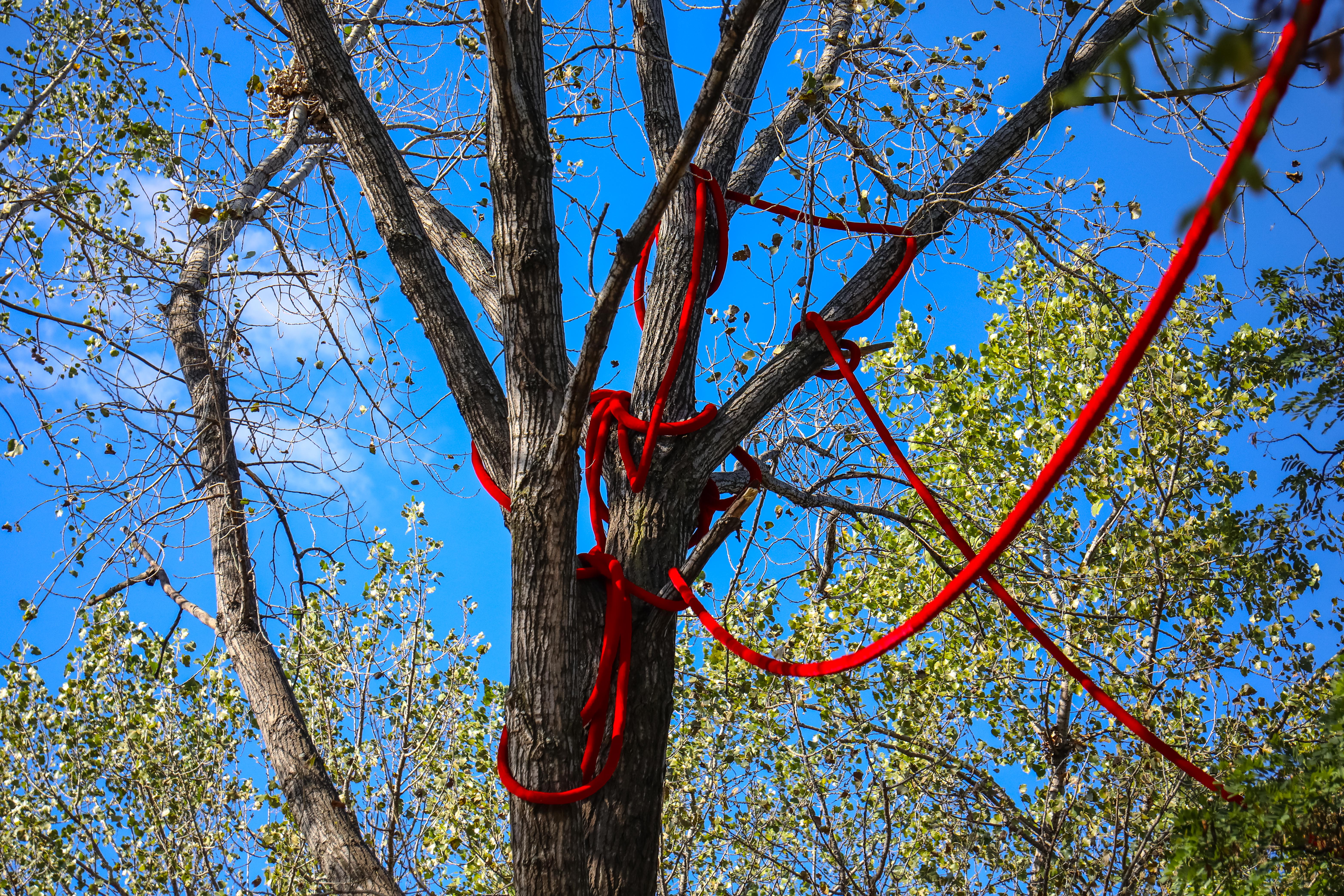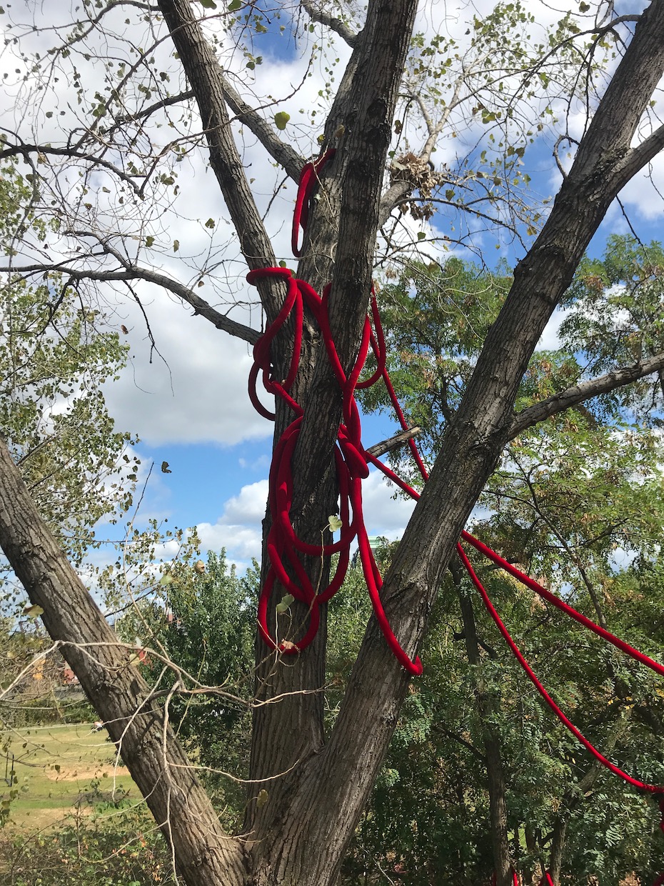 For Access Grove, Soft Stand, Gabriela Salazar weaves, drapes, and wraps velvet rope, the ubiquitous crowd controller and VIP separator, in Socrates’ central grove of trees. The red rope simultaneously blocks, guides, and perhaps confounds visitors, whose bodies are shaped by urbanism and architecture, while passing through this public space. Salazar’s contorting and winding of the rope combined with the wild plants sprouting from the porous textile undermine the authority of this dividing line.