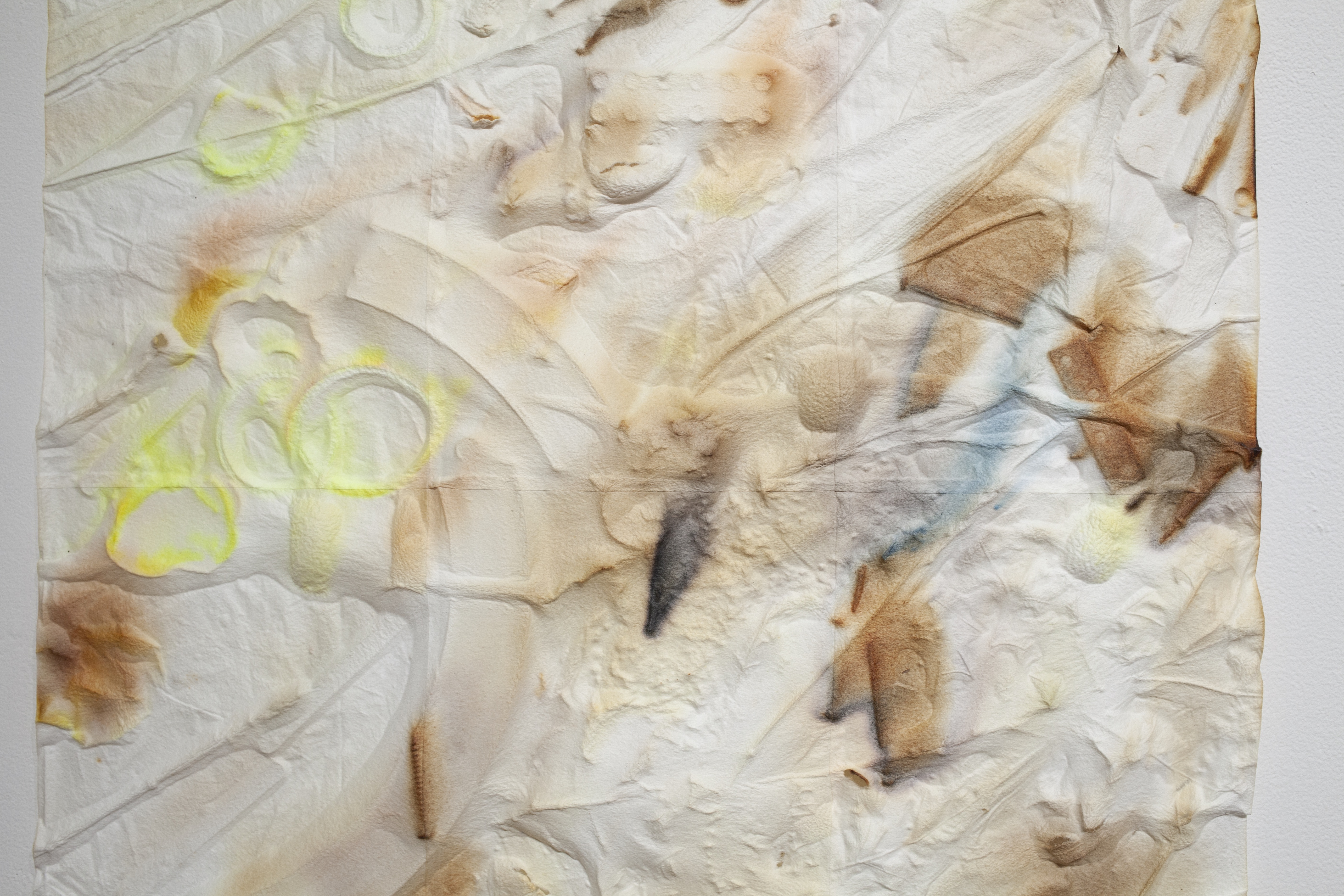 The works in Observed are part of a series Salazar calls “Leaves,” and were all made during her residency at Sarah Lawrence. Laying down prepared sheets of water-soluble paper over various items tied to her intimate world—leaves and branches, food scraps, her architect parents’ drawing stencils, rusty nails, screws, hinges and brackets, and her daughter’s building toys—Salazar then wets the paper until it returns to pulp. As the pulp redries, it becomes a cast of the field of matter, and absorbs the pigments of the plants and objects. These works shift in scale, between that which can be held in one’s hand, and the macro-and-microcosmic, as the applied pigments, residues of plant matter, gesture to other worlds.
